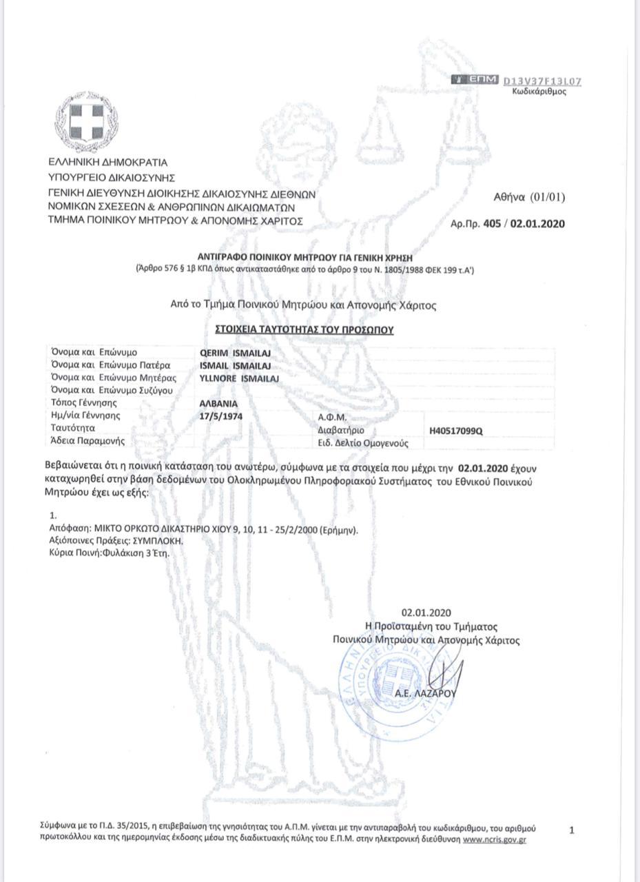 “Sipas vërtetimit me nr. Protokolli 405 të Prokurorisë pranë Gjykatës së Shkallës së Parë Athinë, Edi Rama i Mallakastrës, Qerim Ismailaj, rezulton i dënuar me 3 vjet burgim nga Gjykata e Kios, më datë 25 Shkurt 2000.