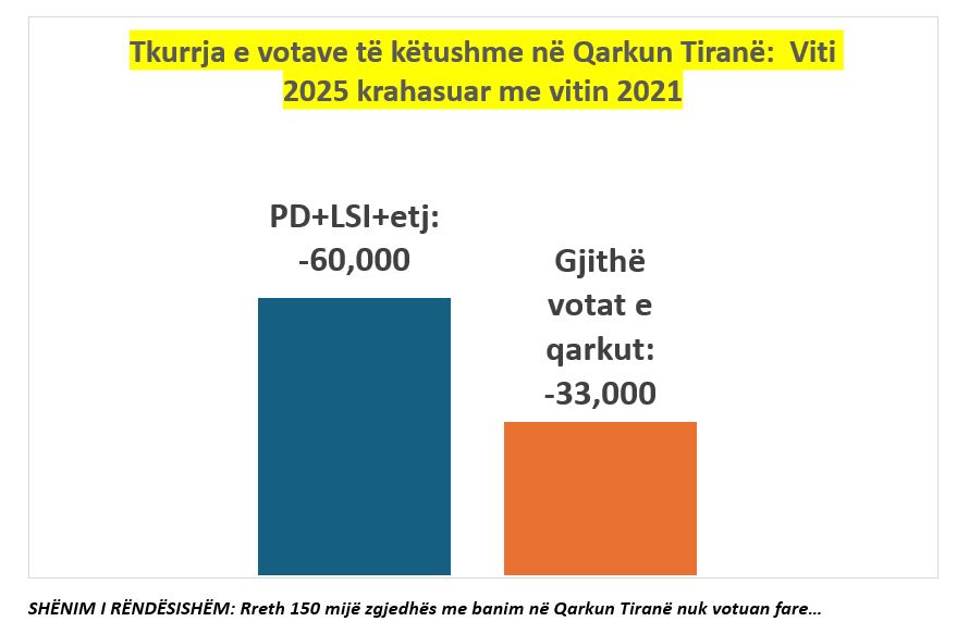 Por partitë e vjetra opozitare (PD, LSI, PDIU etj.), të bashkuara së fundmi në Aleancën për Shqipërinë Madhështore, nuk frymëzuan dot një rritje të pjesëmarrjes në Qarkun Tiranë. Përkundrazi, ato i hapën vetes një gropë të madhe elektorale. Kështu, duke llogaritur vetëm votat e këtushme (pa ato të diasporës), PD+LSI+PDIU+etj. morën plot 60 mijë vota më pak se sa kishin marrë gjithsej më 2021 në Qarkun Tiranë.