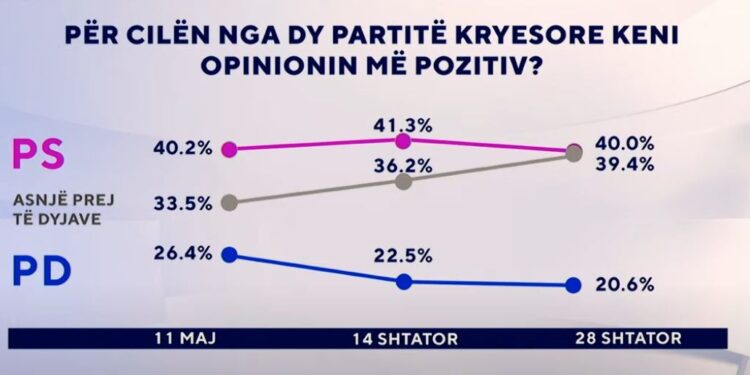 Pyetjes “Për cilën nga dy partitë kryesore keni opinionin më pozitiv?”, zëri i shqiptarëve pohon në kuotën e 40 për qind të të anketuarve për Partinë Socialiste, 20.6 përqind prej tyre për Partinë Demokratike, ndërsa elektorati gri është në kuotën e 39.4 për qind.