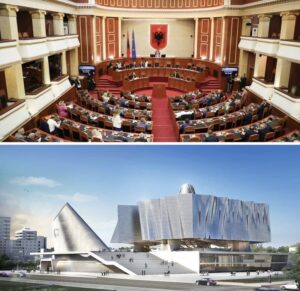 Në foto: Parlamenti ekzistues dhe projekti për parlamentin e ri, që nuk u ndërtua kurrë.