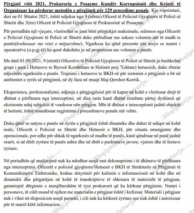 “Në periudhën që analizojmë nuk ka ndodhur asnjë rast dekonspirimi i të dhënave të përfituara nga interceptimi. Oficerët e policisë gjyqësore/Hetuesit e BKH të Strukturës së Përgjimit të Komunikimeve Elektronike, krahas detyrimit për kalimin e informacionit në kohë dhe në dinamikë dhe përgatitjen në kohë të transkripteve të shkruara të materialit të përgjuar, garantojnë dërgimin e menjëhershëm të tyre prokurorit që ka kërkuar përgjimin. Numri i personave, të cilët mund të njihen me materialin e përgjuar është i kufizuar. Materiali i përgjuar nuk i vihet në dispozicion asnjë personi, i cili nuk ka kërkesë zyrtare ose nuk është i autorizuar për të marrë këtë informacion”, thuhet në raportin e SPAK.