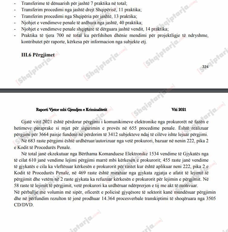 Rreth 5 mijë persona, të dyshuar apo që kanë dijeni për vepra të ndryshme penale, janë përgjuar gjatë vitit 2021, një numër ky rekord krahasuar statistikat e viteve të mëparshme. Rreth 1 500 persona janë përgjuar gjatë vitit të kaluar vetëm nga SPAK, ku si rezultat i përgjimeve është arritur në arrestimin e 179 personave të dyshuar për kryerjen e veprave penale që janë në kompetencë të SPAK, siç është korrupsioni dhe krimi i organizuar. Bilanci reflektohet në raportin veprimtarisë së SPAK për vitin 2021, raport i cili do të paraqitet për shqyrtim në Kuvend dhe në Këshillin e Lartë të Prokurorisë.