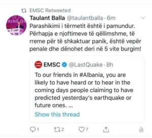 “Parashikimi i tërmetit është i pamundur. Përhapja e njoftimeve të qëllimshme, të rreme për të shkaktuar panik, është vepër penale dhe dënohet deri në 5 vite burgim!”, shkruan Balla duke bashkëngjitur edhe postimin e agjencisë me të madhe sizmologjike që bën thirrje për qetësi pasi lajmet për parashikime tërmetesh jane të rreme.