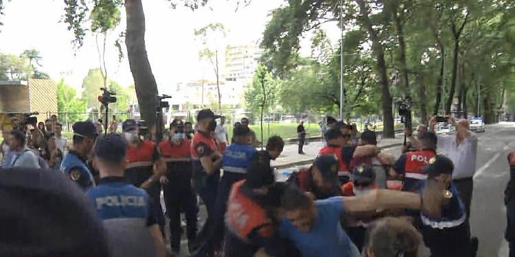 Nga pamjet e transmetuara LIVE në media, protestuesit kanë goditur forcat e rendit me mjete të forta, ndërsa disa prej tyre janë shoqëruar.