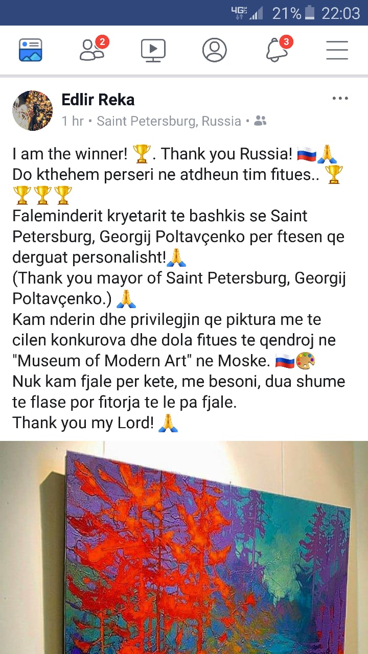 Piktori shqiptar Edlir Reka është shpallur fitues në një konkurs në Rusi dhe tashmë piktura e tij do të qëndrojë në “Muzeun e Artit Modern” në Moskë.