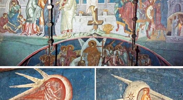 Është e lehtë të pyesësh veten pse artistët e atyre shekujve shumë kohë më parë dukeshin të obsesionuar në përfshirjen e këtyre objekteve kurioze në skena që rrethonin tregimet e lindjes dhe vdekjes së Jezu Krishtit. Shembulli i parë këtu është një mur, ose afresk, që daton nga viti 1350, “Kryqëzimi”, i pikturuar nga një artist i panjohur, në Manastirin e Deçanit në Kosovë. Dy objekte të çuditshme me “pilotë” mund të shihen në qiell në të dy anët e Jezusit.