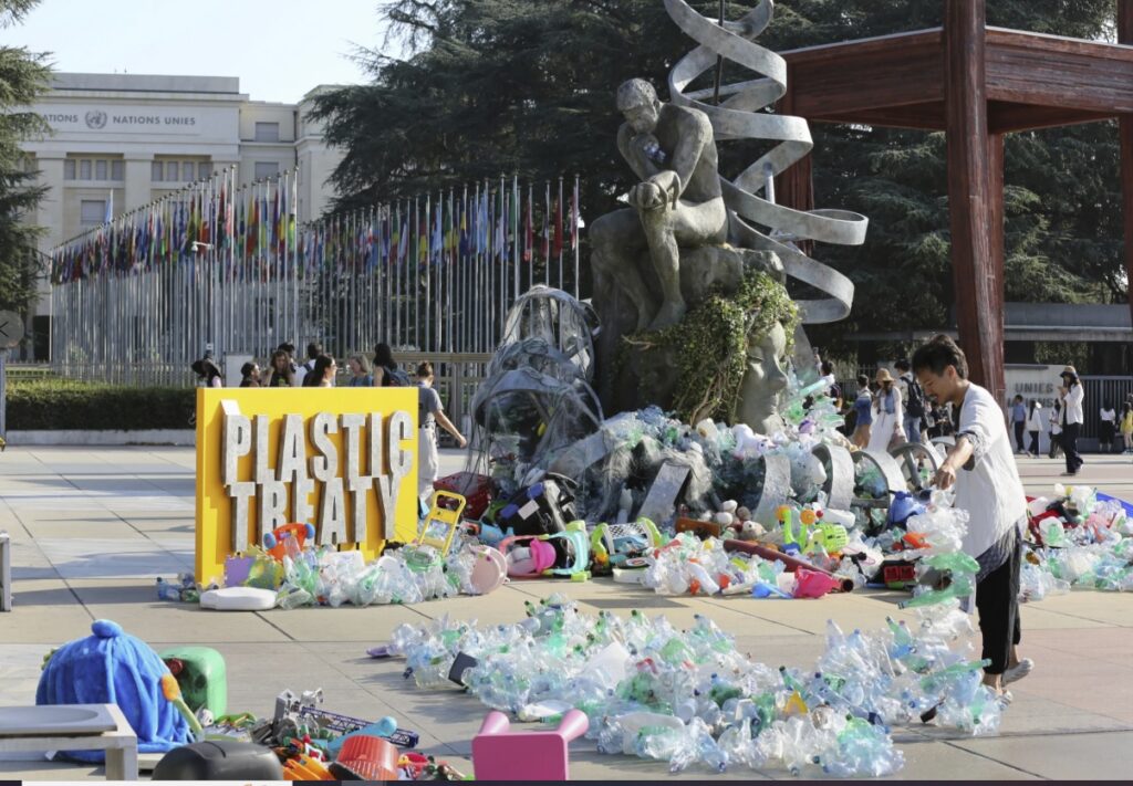 Ndërsa e hëna shënon javën e dytë të negociatave mes kombeve për një dakordësi globale që t’i japë fund ndotjes nga plastika, një artist vendosi grumbuj mbeturinash plastike mbi një skulpturë para godinës së Kombeve të Bashkuara në Gjenevë.