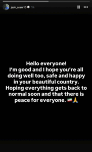 Një ditë pas sulmeve në vendin e Gjirit Persik, Jasir Asani ka reaguar në rrjetet sociale nëpërmjet një Instagram Story duke i siguruar të gjithë se është mirë dhe duke u shprehur se shpreson që gjithçka të kthehet në normalitet sa më shpejt.