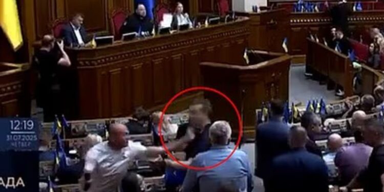 Përplasja fizike mes deputetëve ndodhi në një atmosferë të tensionuar dhe u transmetua drejtpërdrejt, në atë që ishte seanca e parë parlamentare publike që nga fillimi i luftës me Rusinë. Arsyeja e konfliktit nuk u bë e ditur.