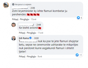 Nuk munguan edhe disa komente në videon që kreu i qeverisë shpërndau në faqen e tij në Facebook, ku njëri nga ndjekësit shkruante me ironi se “po flamuri shqiptar ku është, e mori era?”.