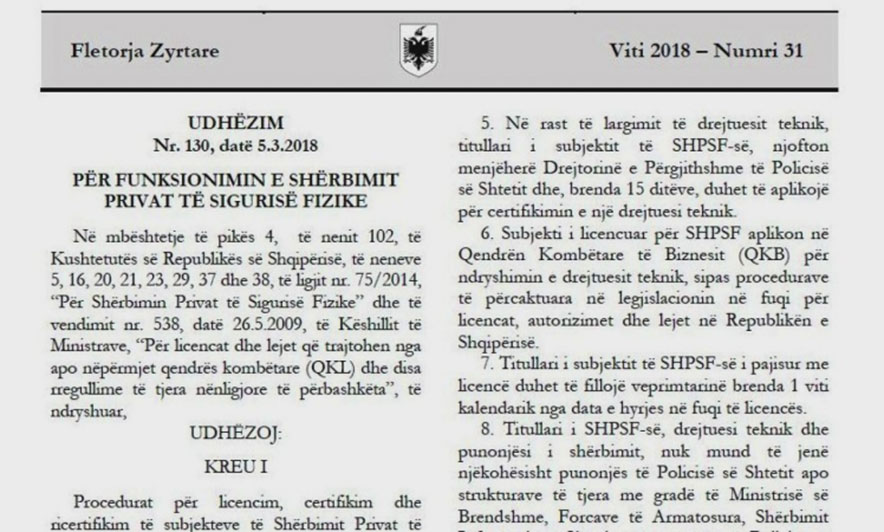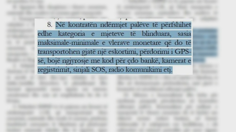 “Në kontratën ndërmjet palëve të përfshihet edhe kategoria e mjeteve të blinduara, sasia maksimale-minimale e vlerave monetare që do të transportohen gjatë një eskortimi, përdorimi i GPS-it, bojë ngjyrosjeje me kod për çdo bankë, kamerat e regjistrimit, sinjali SOS, radio komunikimi etj.”.