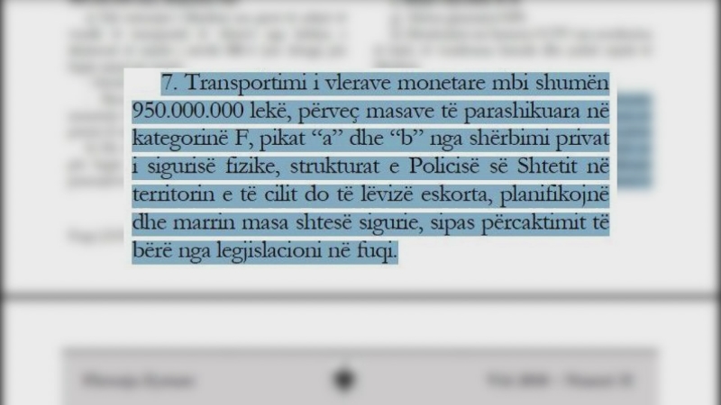 “Transportimi i vlerave monetare mbi shumën 950.000.000 lekë, përveç masave të parashikuara në kategorinë F, pikat “a” dhe “b” nga shërbimi privat i sigurisë fizike, strukturat e Policisë së Shtetit në territorin e të cilit do të lëvizë eskorta, planifikojnë dhe marrin masa shtesë sigurie, sipas përcaktimit të bërë nga legjislacioni në fuqi”.