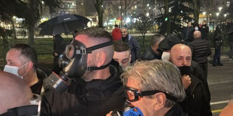 Pas kësaj, policia ka hedhur ujë dhe gaz lotsjellës, çka ka detyruar kryedemokratin Sali Berisha të vërë sërish maskën anti-gaz.