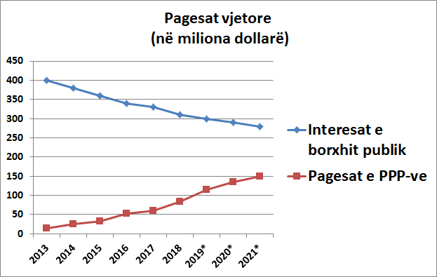 Në qoftë se situata fiskale nuk pëson ndryshime rrënjësore, shpenzimet vjetore për pagesat ndaj firmave të PPP-ve do të vazhdojnë rritjen, ndërkohë që pagesat për interesat e borxhit publik do të vazhdojnë uljen. Sidoqoftë, të dyja këto lloj pagesash (të marra së bashku) do të përbëjnë një barrë fiskale në të ardhmen, duke konkurruar për të njëjtën qese të taksave tona e të fëmijëve tanë.