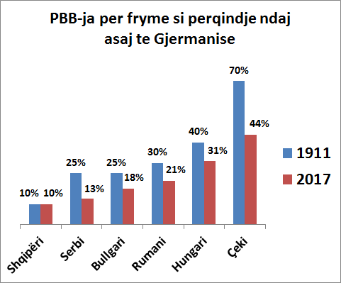 Siç mund të shihet në Grafikun 1, PBB-ja për frymë e Shqipërisë ka mbetur sa 10% e asaj të Gjermanisë edhe pas një shekulli. Ndërkohë të gjitha vendet e tjera kanë qenë më afër Gjermanisë para një shekulli, në krahasim me sot. Largimi më dramatik vërehet në Çeki, e cila para një shekulli e kishte PBB-në për frymë sa 70% e asaj të Gjermanisë, ndërsa sot e ka sa 44% e asaj të Gjermanisë.