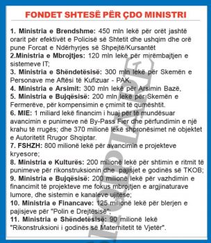 Qeveria gjen para për të paguar orët shtesë të punonjësve të policisë. Fondi i vënë në dispozicion është 450 milionë lekë. Punonjësit e uniformave blu do të kenë në llogaritë e tyre gjatë muajve nëntor dhe dhjetor pagesat për orët shtesë të pa paguara deri tani. Ndërkohë edhe fermerët do të marrin kompensimin për çmimin e qumështit, për të cilin është vënë në dispozicion një fond prej 200 milionë lekësh. Parlamenti miratoi dje Aktin Normativ Nr. 2 “Për disa ndryshime në ligjin “Për buxhetin e vitit 2019”, ku janë parashikuar edhe fondet për orët shtesë të punonjësve të policisë dhe kompensimin për çmimin e qumështit për fermerët. Në katin normativ është parashikuar edhe një fond prej 300 milionë lekësh për Skemën e Personave me Aftësi të Kufizuar 120 milionë lekë për mirëmbajtjen e sistemit IT të Ministrisë së Mbrojtjes, Ministrinë e Arsimit një fond prej 300 milionë lekë për Arsimin Bazë.