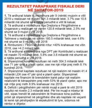 “Treguesit kryesorë të ekonomisë gjatë tremujorit të dytë dëshmojnë për bazat e forta në disa drejtime: ecurinë pozitive në tregun e punës kur papunësia u ul nën nivelin prej 12% dhe punësimi u rrit me 3.3%; stabilitetin financiar dhe përshpejtimin e kreditimit të ekonomisë, ku kreditë me probleme janë ulur deri në nivelin e 11%, ndërsa kreditimi i sektorit privat të ekonomisë është zgjeruar për tre tremujorë rresht të vitit, duke regjistruar një rritje prej mbi 7% kundrejt një viti më parë; -qëndrueshmërinë e financave publike dhe vijimin e konsolidimit fiskal, ku pritshmëria e deficitit buxhetor mbetet nën 2% nga 5% të PBB-së në vitin 2013, ndërsa borxhi publik neto është reduktuar vitet fundit nga niveli më i lartë prej 71.9% të PBB i regjistruar në vitin 2015 në rreth 64% i pritshëm për vitin 2019”-tha Denaj. Sipas ministres investimet e huaja direkte janë rritur me 10% në tremujorin e parë dhe me pothuajse 20% në tremujorin e dytë. Ministrja Denaj vuri në dukje se rezultatet paraprake fiskale deri në shtator 2019 tregojnë se realizimi i përgjithshëm i buxhetit mbetet plotësisht në përputhje me objektivat dhe parametrat kryesorë fiskalë. Në fjalën e saj, ministrja Denaj informoi se arsyet kryesore të paraqitjes së Aktit Normativ janë: Garantimi i financimit të fondit rezervë të buxhetit të shtetit, në vijim të situatës emergjente të krijuar pas tërmetit të datës 21 shtator 2019; Kompensimi i disa zërave të shpenzimeve buxhetore, të prekura në 2019 për efekt të financimit të Paktit për Universitetin; Reflektimi i ecurisë optimale të të ardhurave vendore, gjatë gjysmës së parë të vitit 2019. Rritja e eficiencës së përdorimit të burimeve publike për rialokimet drejt projekteve të investimeve me progres të mirë deri tani. Gjithashtu, Denaj sqaroi se disa prej synimeve kryesore të këtij Akti Normativ janë Ruajtja e nivelit të planifikuar në buxhetin e vitit 2019, të parametrave kryesorë makroekonomikë, si dhe sistemime dhe/ose rialokime të tjera pa kosto shtesë efektive mes zërave të shpenzimeve buxhetore, por të cilat ndikojnë ndjeshëm në rritjen e performancës së pritshme të realizimit të treguesve në fund të vitit 2019./GSH.al