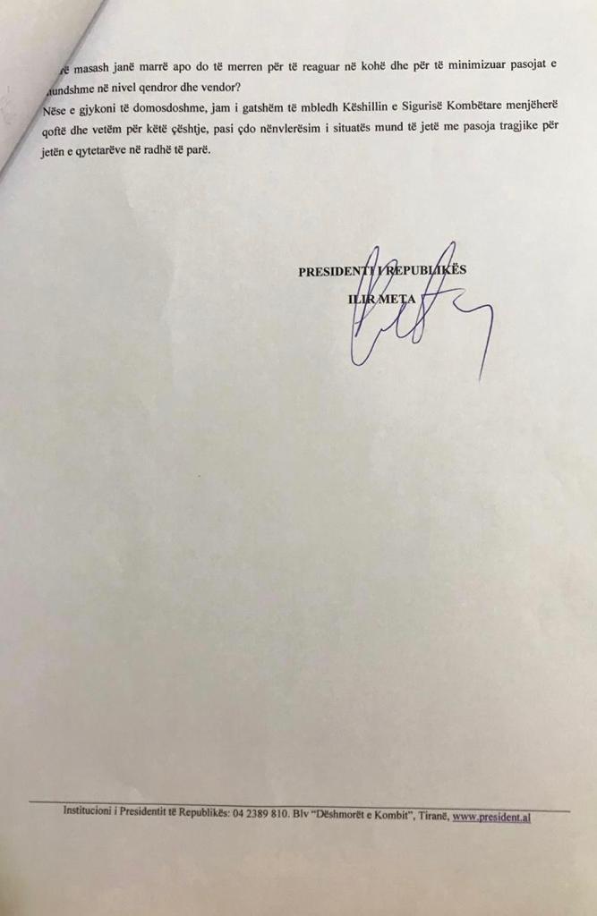 Në një letër që po qarkullon në media, kreu i shtetit duket se ka hedhur pas krahëve situatën politike në vend dhe i drejtohet i shqetësuar kryeministrit Edi Rama, ministrit të Brendshëm, Sandër Lleshaj dhe ministres së Mbrojtjes, Olta Xhaçka.