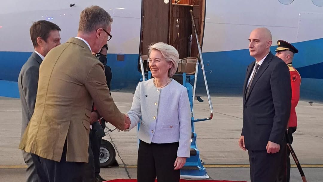 Presidentja e Komisionit Evropian, Ursula von der Leyen ka mbërritur në Tiranë mëngjesin e sotëm, ndërsa është pritur në aeroport nga ambasadori i BE-së në Shqipëri, Silvio Gonzato.
