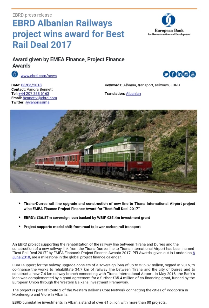 Rehabilitimi i linjës hekurudhore Tiranë-Durrës dhe ndërtimi i linjës së re drejt Aeroportit Ndërkombëtar të Tiranës fiton çmimin e EMEA Finance “Projekti më i mirë hekurudhor në 2017” në kategorinë e Financimit të Projekteve. Huaja sovrane e BERZH prej 36.87 milionë Euro mbështetet nga një grant investimi prej 35.4 milionë Euro i Platformës të Investimeve për Ballkanin Perëndimor (WBIF). Projekti mbështet kalimin nga transporti rrugor në atë hekurudhor i cili ka një nivel më të ulët ndotjeje karboni.
