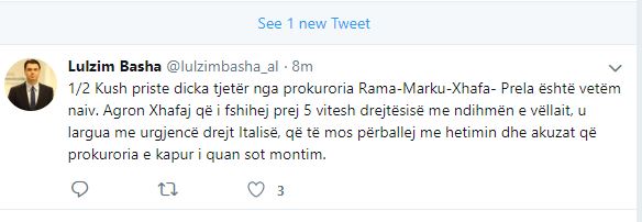 “Kush priste dicka tjetër nga prokuroria Rama-Marku-Xhafa- Prela është vetëm naiv. Agron Xhafaj që i fshihej prej 5 vitesh drejtësisë me ndihmën e vëllait, u largua me urgjencë drejt Italisë, që të mos përballej me hetimin dhe akuzat që prokuroria e kapur i quan sot montim”, shkruan Basha./a.m.