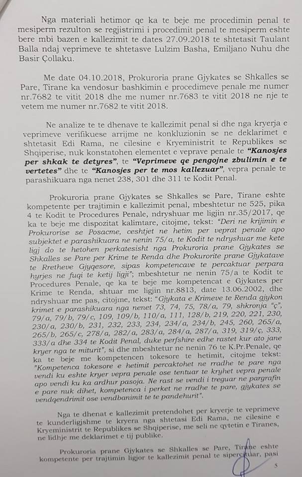 Pas kallëzimit që bënë krerët e grupeve parlamentare të PD-së Edmond Spaho dhe ai i LSI-së Petrit Vasili për kryeministrin Edi Rama, lidhur me deklaratat e këtij të fundit ndaj oficerit Emiljano Nuhu, vjen përgjigja nga prokuroria.