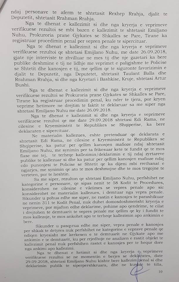 Kjo e fundit ka mbyllur çështjen ndaj Ramës lidhur me pretendimet e opozitës se Rama kërcënoi Nuhun, i cili denoncoi publikisht djalin e deputeti te PS Rrahman Rraja.
