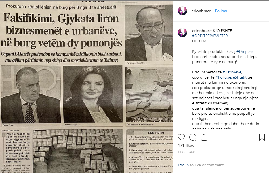 Me nje shenim te gjate ne faqen e tij ne rrjetin social “Facebook”, duke kujtuar rastin me te fundit, ku Gjykata e Tiranës liroi nga burgu administratorët e kompanive të transportit publik, që u arrestuan pak ditë më parë nën dyshimin se falsifikonin bileta urbani dhe la ne burg punonjesit, numri dy i qeverisë shkruan se pergjigja do te jete Vetingu.