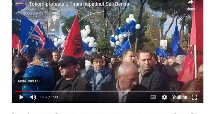 “Ish-presidenti i Shqipërisë Sali Berisha, i cili drejton demonstratat e opozitës në këtë qytet, është sulmuar në bulevardin Dëshmorët e Kombit. Qeveria ka ndaluar hyrjen në vendin ku mbahet sot Samiti BE-Ballkani Perëndimor”, shkruan më tej Russia Today.