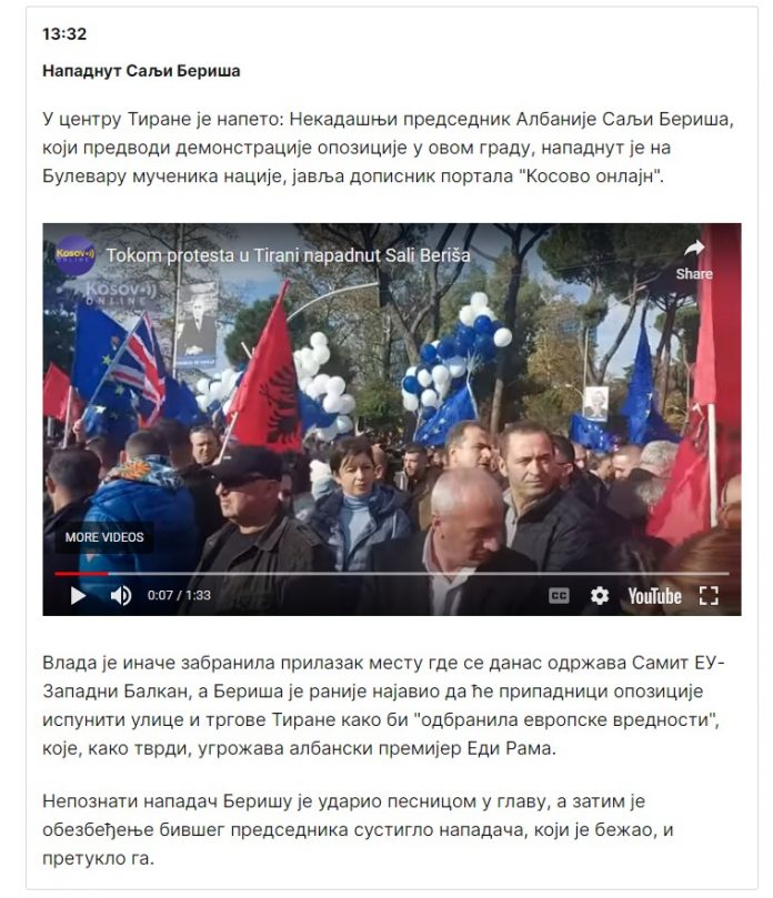 “Ish-presidenti i Shqipërisë Sali Berisha, i cili drejton demonstratat e opozitës në këtë qytet, është sulmuar në bulevardin Dëshmorët e Kombit. Qeveria ka ndaluar hyrjen në vendin ku mbahet sot Samiti BE-Ballkani Perëndimor”, shkruan më tej Russia Today.