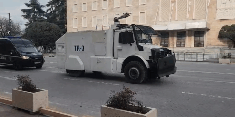 Përqark godinës së Kryeministrisë shihen automjete të shumta policore, autoambulanca, si dhe makina të hedhjes së ujit.