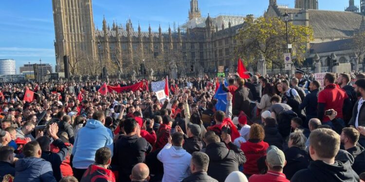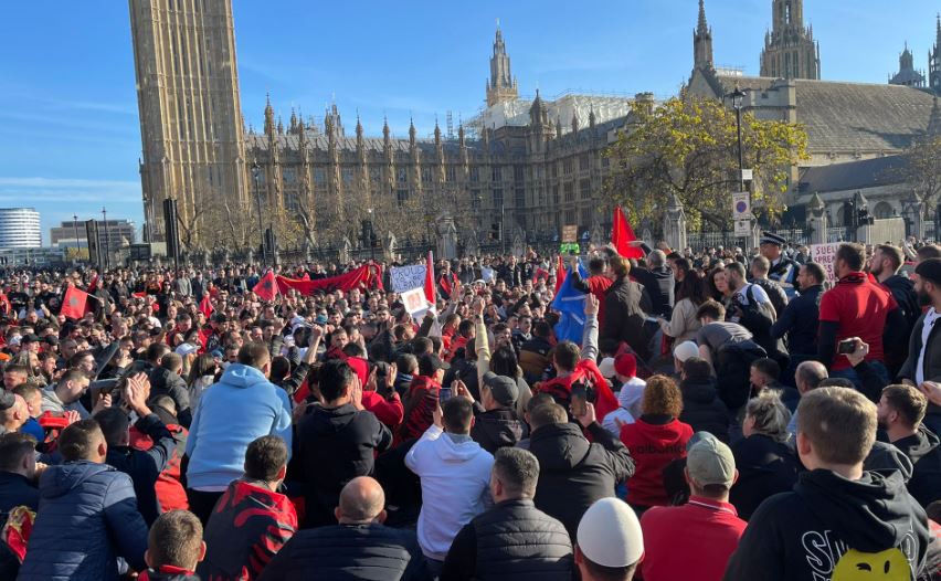 Emigrantët kanë “rrethuar” edhe Parlamentin britanik, ndërsa nuk kanë munguar edhe thirrjet “O sa mirë me qen shqiptar”.