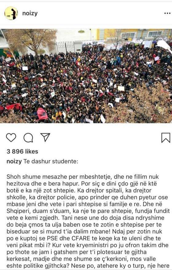 Vjen dhe rradha e tij. Një nga këngëtarët më të dashur për të rinjtë, Noizy ka reaguar sot në lidhje me protestën e studentëve.Në një mesazh në rrjetet sociale, ai i ka bërë thirrje të rinjve që protestojnë, që të ulen në bisedime me qeverinë për të plotësuar kërkesat e tyre.