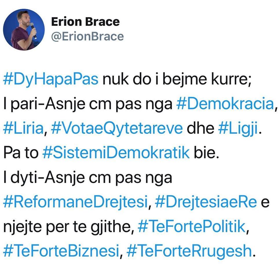 Me nje shenim ne faqen e tij ne Facebook, Braçe apelon per qetesi, durim dhe ligj. Nderkohe qe shkruan se dy hapa pas qe nuk do te beje kurre qeveria jane demokracia, liria e vota dhe reforma ne drejtesi.