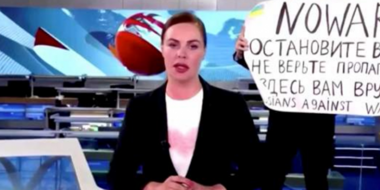 Gruaja që ndërpreu një program të drejtpërdrejtë lajmesh në TV shtetëror rus mbrëmë është aktualisht në gjyq në Gjykatën Ostankino të Moskës.