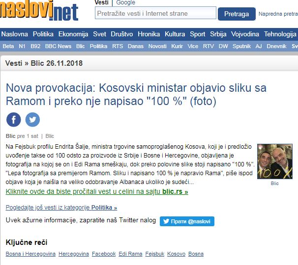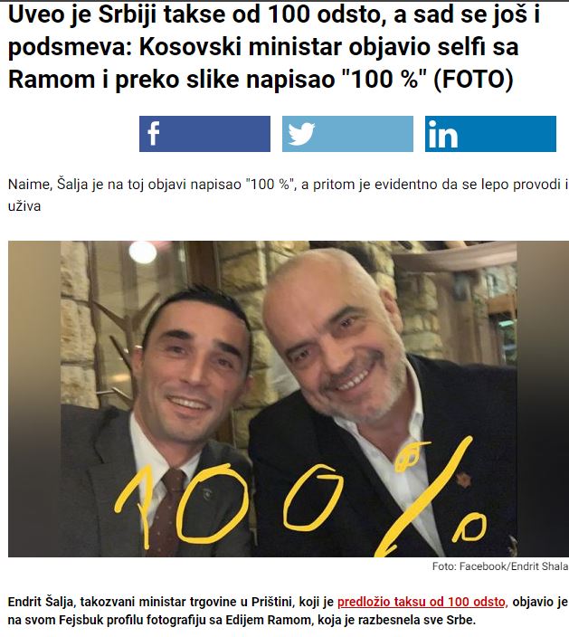Ministri i Tregtisë dhe Industrisë te Kosoves Endrit Shala publikoi të dielën një fotografi me kryeministrin Edi Rama, në të cilën shkruhej 100% duke treguar përkrahjen e Ramës për vendimin e Qeverisë së Kosovës ndaj produkteve serbe. Fotografia me mbishkrimin 100 %, bëri që të reagojnë mediet serbe.