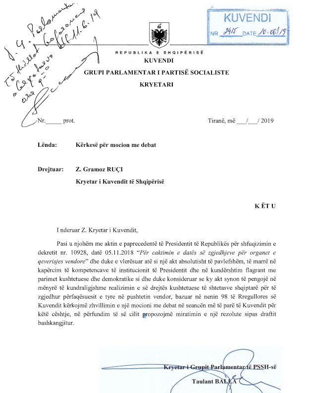 Partia Socialiste e Shqipërisë ka dorëzuar në Kuvend kërkesën për mocion me debat në seancën e së enjtes pas vendimit të Presidentit Meta për të anuluar zgjedhjet lokale të 30 Qershorit pa afat.