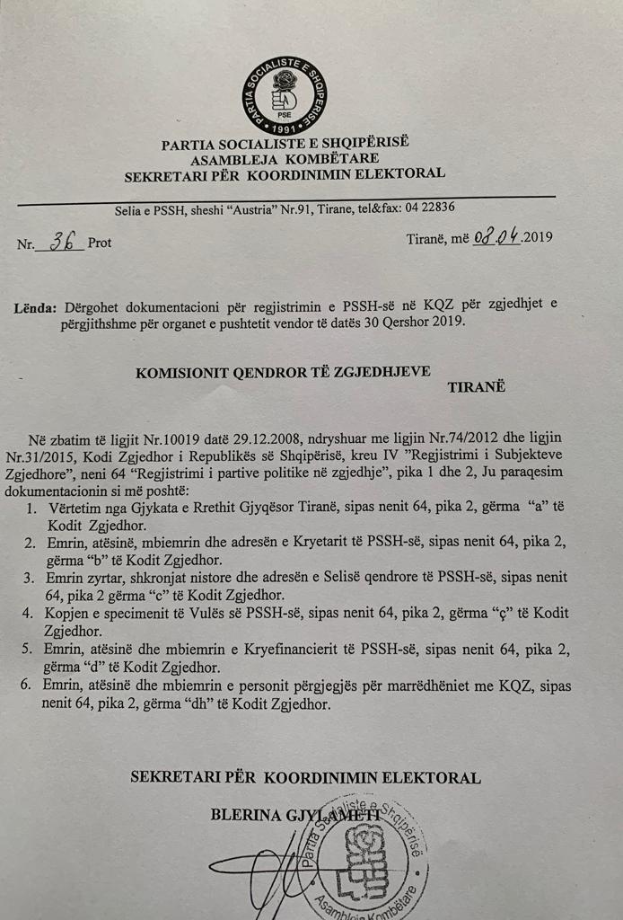 Partia Socialiste ka dërguar sot kërkesën në Komisionin Qendror të Zgjedhjeve për t’u regjistruar si forcë politike që do të garojë në zgjedhjet vendore të 30 qershorit.