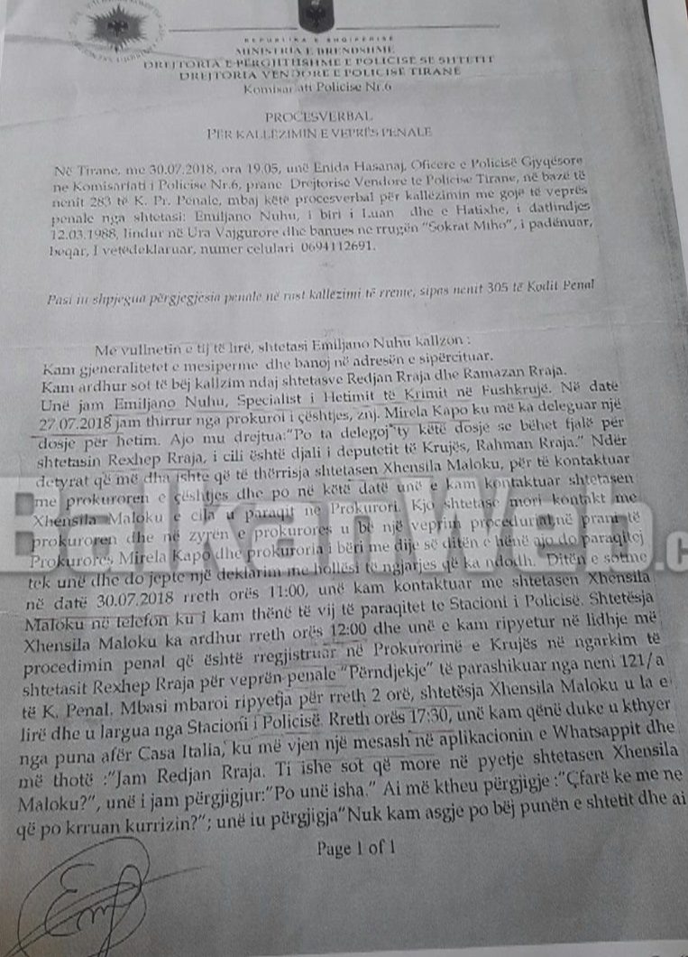 Zbardhet procesverbali i kallëzimit të nën-komisarit të Krujës, Emiljano Nuhu në komisariatin numër 6 në Tiranë.