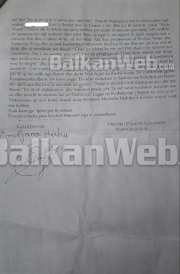 BalkanWeb raporton se më 30 korrik 2018, Nuhu kallëzoi në polici se u kërcënua nga Redjan dhe Ramazan Rraja, nipër të deputetit të PS Rahman Raja. Emiljano Nuhu jep detaje në polici në lidhje me bisedën e bërë në lokalin ‘Rich Mond’ ku ndodhi takimi mes tyre.