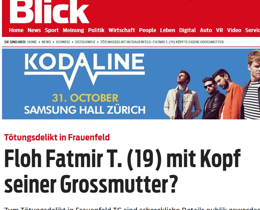 Një ngjarje tronditëse ka ndodhur në Zvicër, pasi një i ri shqiptar i ka prerë kokën gjyshes së tij. Vrasja makabre është raportuar nga media zvicerane “Blick” 4 ditë më parë, nipi i të moshuarës Fatmir T. Është i dyshuari kryesor. Media tjetër “20 Minuten”, tregon se kur autoritetet kanë shkuar në shtëpinë e gjyshes së Fatmirit i gjetën asaj vetëm trupin.