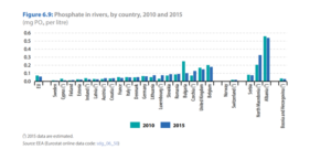 Sipas grafikut më poshtë, niveli i fosfatit në lumenjtë shqiptarë është gati sa dyfishi i mesatares në lumenjtë europiane.