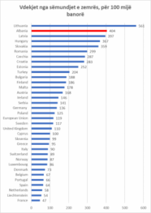 Ndërsa mesatarja e Bashkimit Europian është shumë më e ulët, në 1190 vdekje për 1 milion banorë, ose gati 4 herë më e ulët se në Shqipëri. Shtetet, ku ka më pak vdekje nga sëmundjet e qarkullimit të gjakut janë Franca (470 për milionë banorë), Holanda (580) dhe Spanja (640).