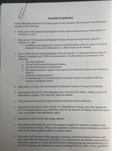 Po ashtu njëra ndër pikat është se dy palët do të përfshihen në të ashtuquajturën Zonën Mini-Shengen. Dy vendet do të punojnë me SHBA për “Hekurudhën e Paqes”, për lidhjen mes Prishtinës, Merdarës dhe Nishit. Po kështu sipas marrëveshjes së nënshkruar, dy vendet do të njohin mes tyre diplomat e certifikatat profesionale. Të dyja palët nuk do të lejojnë përdorimin e 5G.