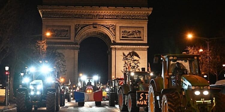 Traktorët hynë në Paris pak pas orës 6 të mëngjesit përmes Porte Dauphine, të shoqëruar nga policia, dhe lëvizën me shpejtësi nëpër Avenue Foch drejt Harkut të Triumfit përpara se të kalonin përgjatë Champs-Elysées.