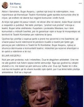 Rama citon në “Facebook” fjalët e aktorit Asqeriu, i cili thotë se në atë godinë nuk do të futet më, pas sipas tij, është sëmundje.
