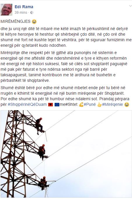 “MIRËMËNGJES dhe ju uroj një ditë të mbarë me këtë imazh të përkushtimit në detyrë të këtyre heronjve të heshtur që shërbejnë çdo ditë, në çdo orë dhe shumë më fort në kushte tejet të vështira, për të siguruar furnizimin me energji për qytetarët kudo ndodhen.