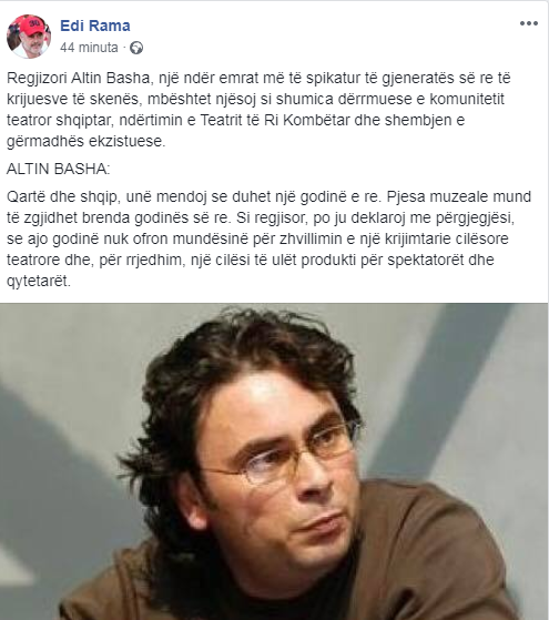 “Regjizori Altin Basha, një ndër emrat më të spikatur të gjeneratës së re të krijuesve të skenës, mbështet njësoj si shumica dërrmuese e komunitetit teatror shqiptar, ndërtimin e Teatrit të Ri Kombëtar dhe shembjen e gërmadhës ekzistuese”, shkruan Rama.