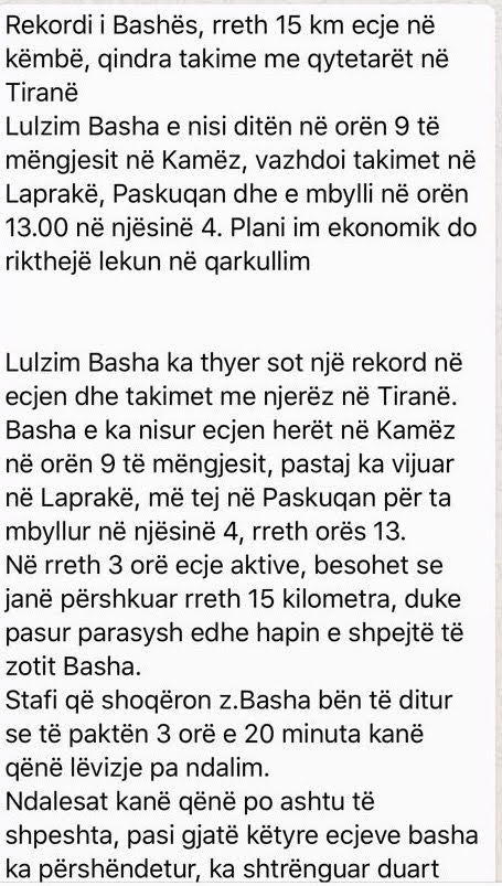 Ditën e sotme stafi pranë Lulzim Bashës njoftoi se ky i fundit ka ecur në këmbë mbi 3 orë nëpër Tiranë. /javanews/b.d