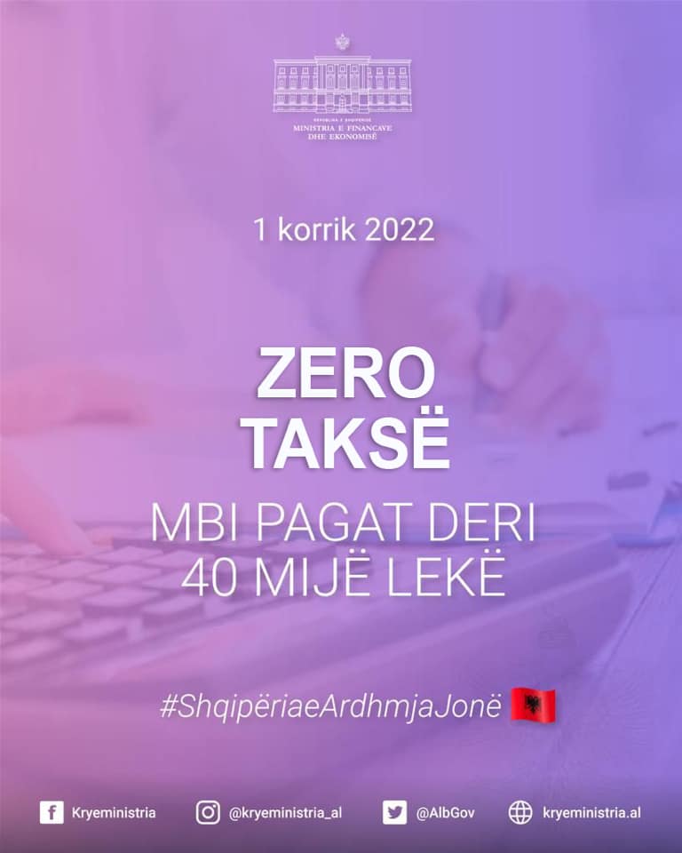 Me anë të një postimi në Facebook Rama njofton se nga data 1 korrik e vitit të ardhshëm taksa do të jetë zero për pagat deri në 400Mijë lekë të vjetra.